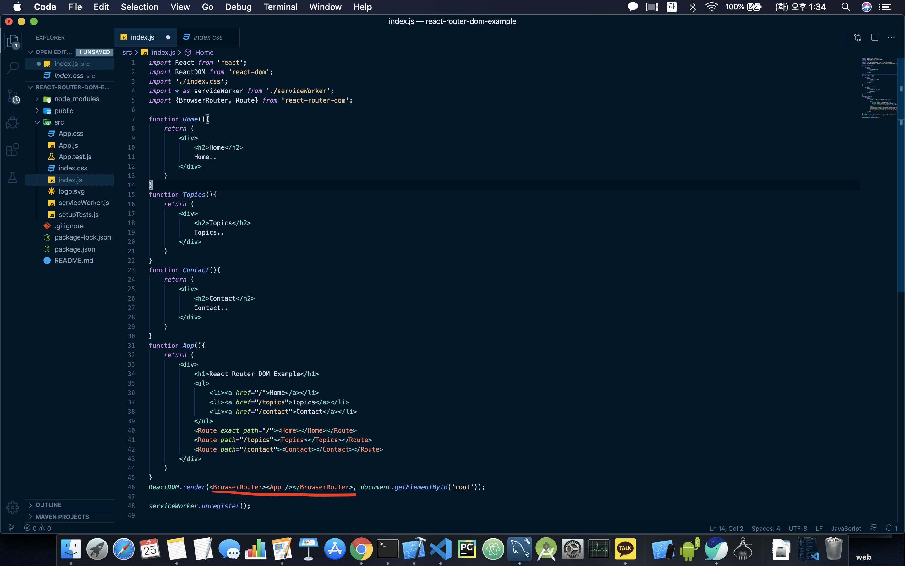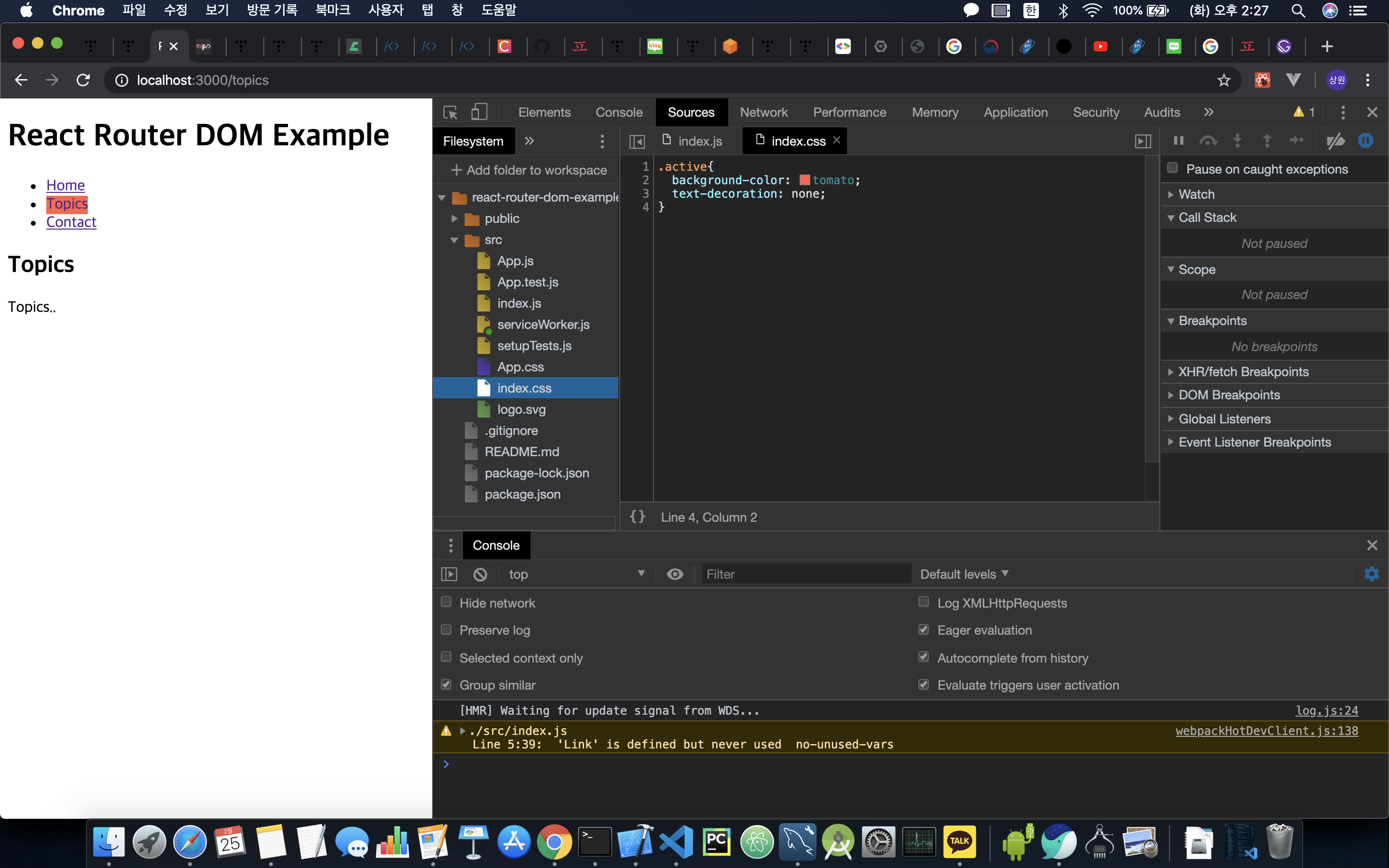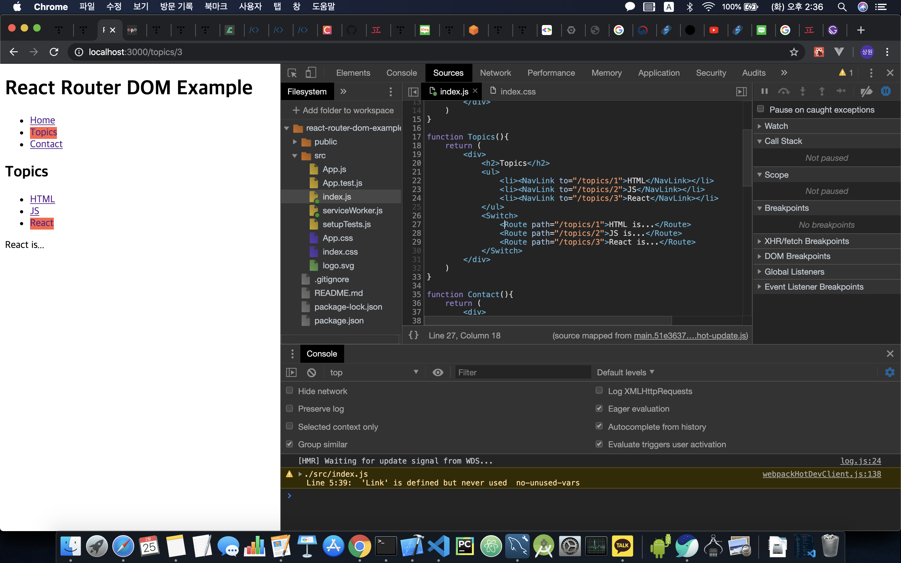 - 먼저 브라우저에서 개발을 할 수 있도록 다음과 같이 개발자 도구 - Sources - Filesystem 에 들어가서 폴더를 추가 후 작업한다.함수들을 다음과 같이 간단하게 작성하고 react-router-dom을 설치하고 import해준다.