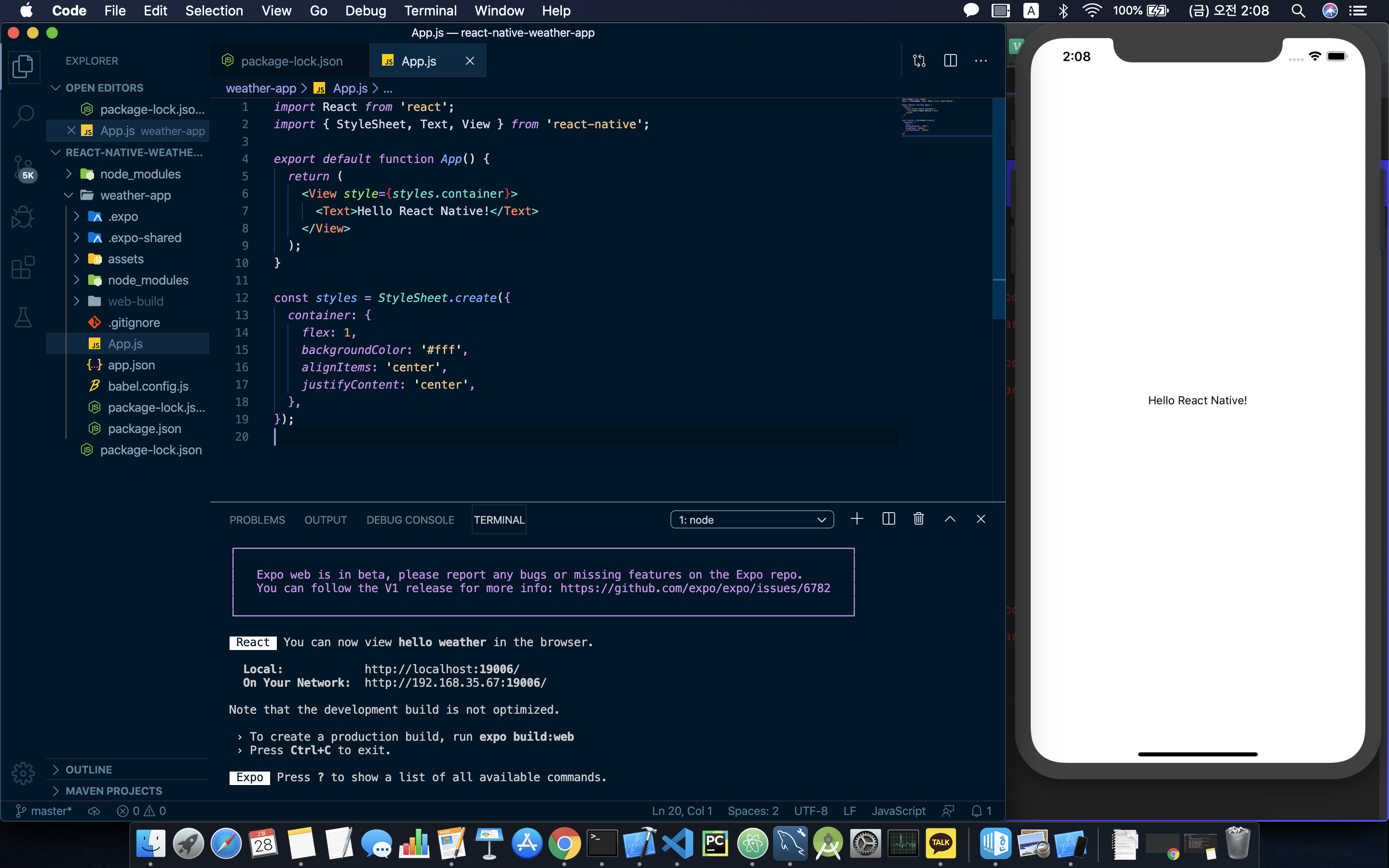 - 웹에서 div, span이 있는 것처럼 RN에는 view, text와 같은 페이스북이 만든 다른 요소가 존재하고 이 요소들은 다 네이티브 코드로 변환된다.