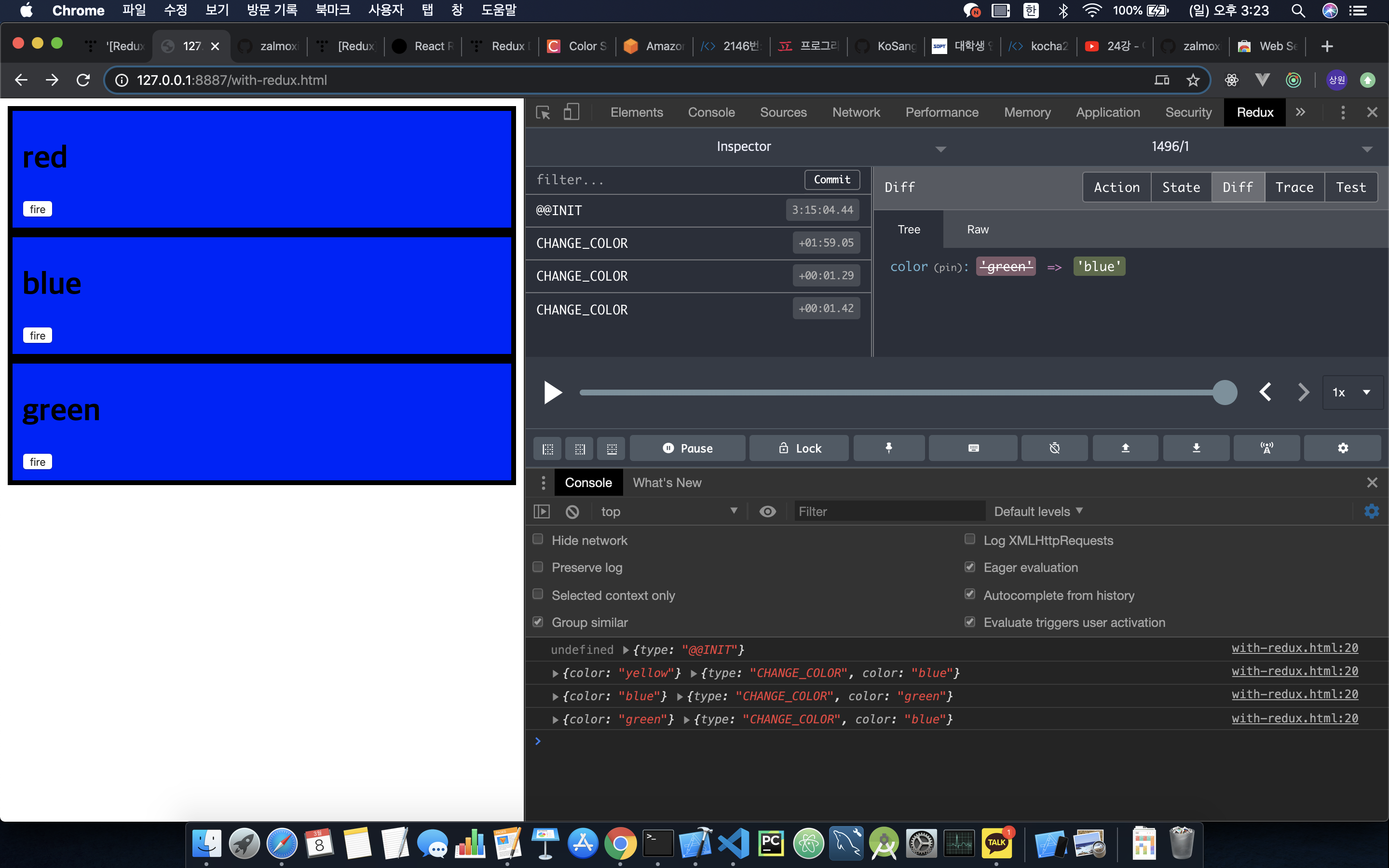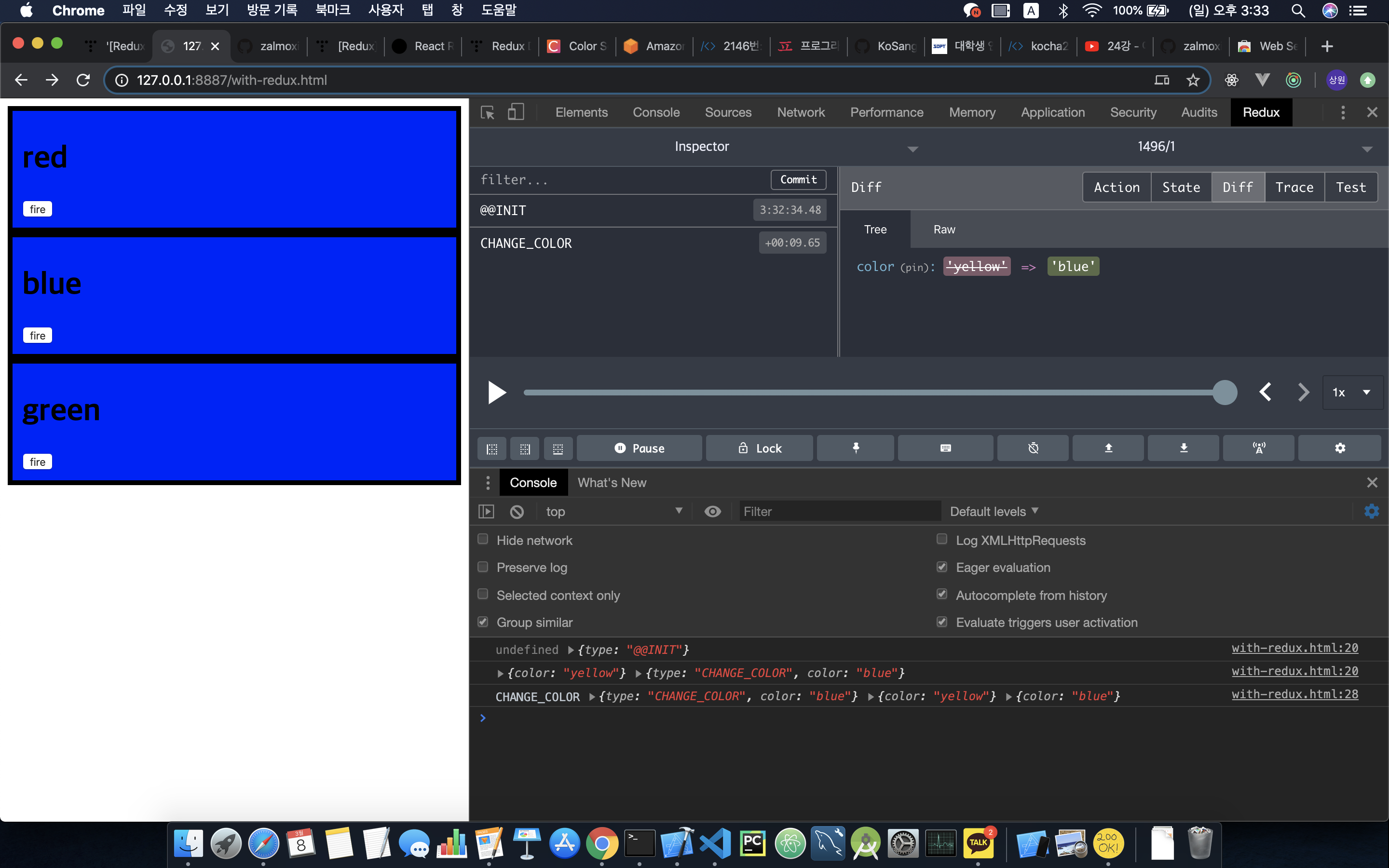 - 주의할 점이 file://~~ 이런식으로 브라우저에서 열면 Redux개발자 도구가 열리지 않고 local server올리고 그곳에서 html파일을 열어야 한다. web Server for Chrome 을 설치 후 실행하여 해결할 수 있다.