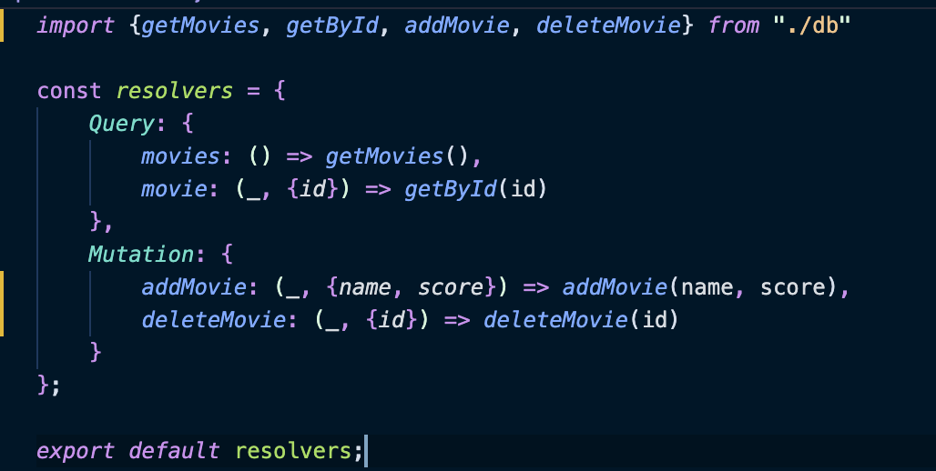 - 먼저 resolvers.js를 다음과 같이 작성한다.