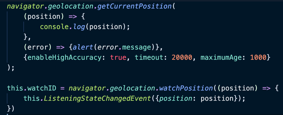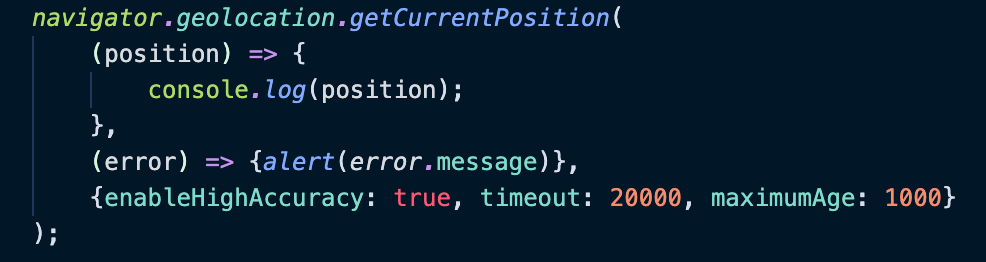 - getCurrentPosition은 성공 콜백(success callback), 에러 콜백(error callback), getOptions 이렇게 3개의 인자를 받는다.