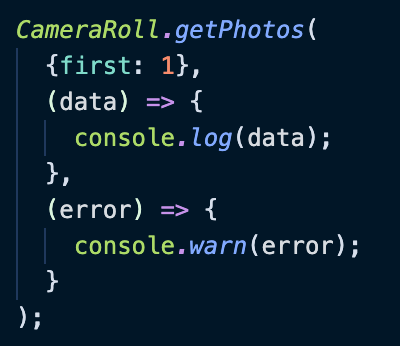 - 리액트 네이티브는 스마트폰에서 카메라로 찍은 사진이 저장되는 카메라롤(CameraRoll) 인터페이스를 제공한다.
