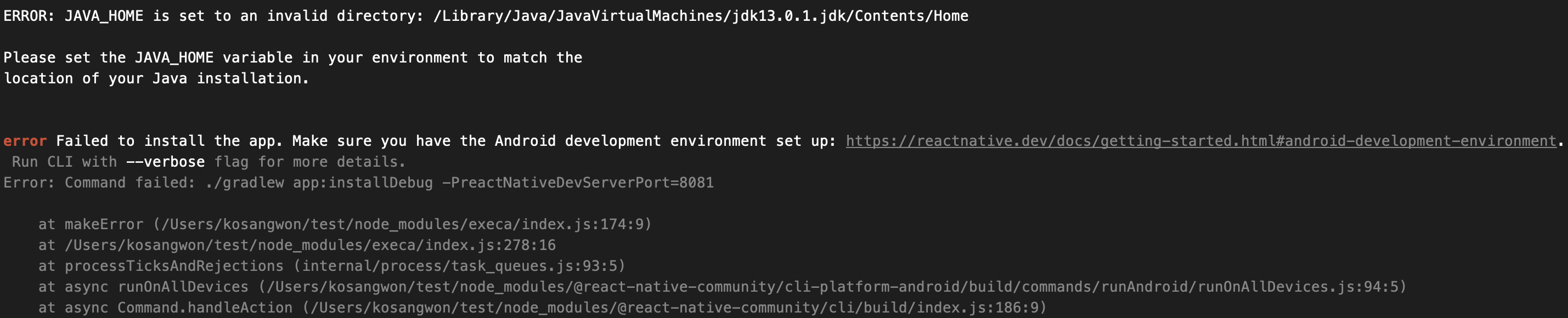 - react-native run-android를 실행했더니 다음과 같이 JAVA_HOME 오류가 떴다.