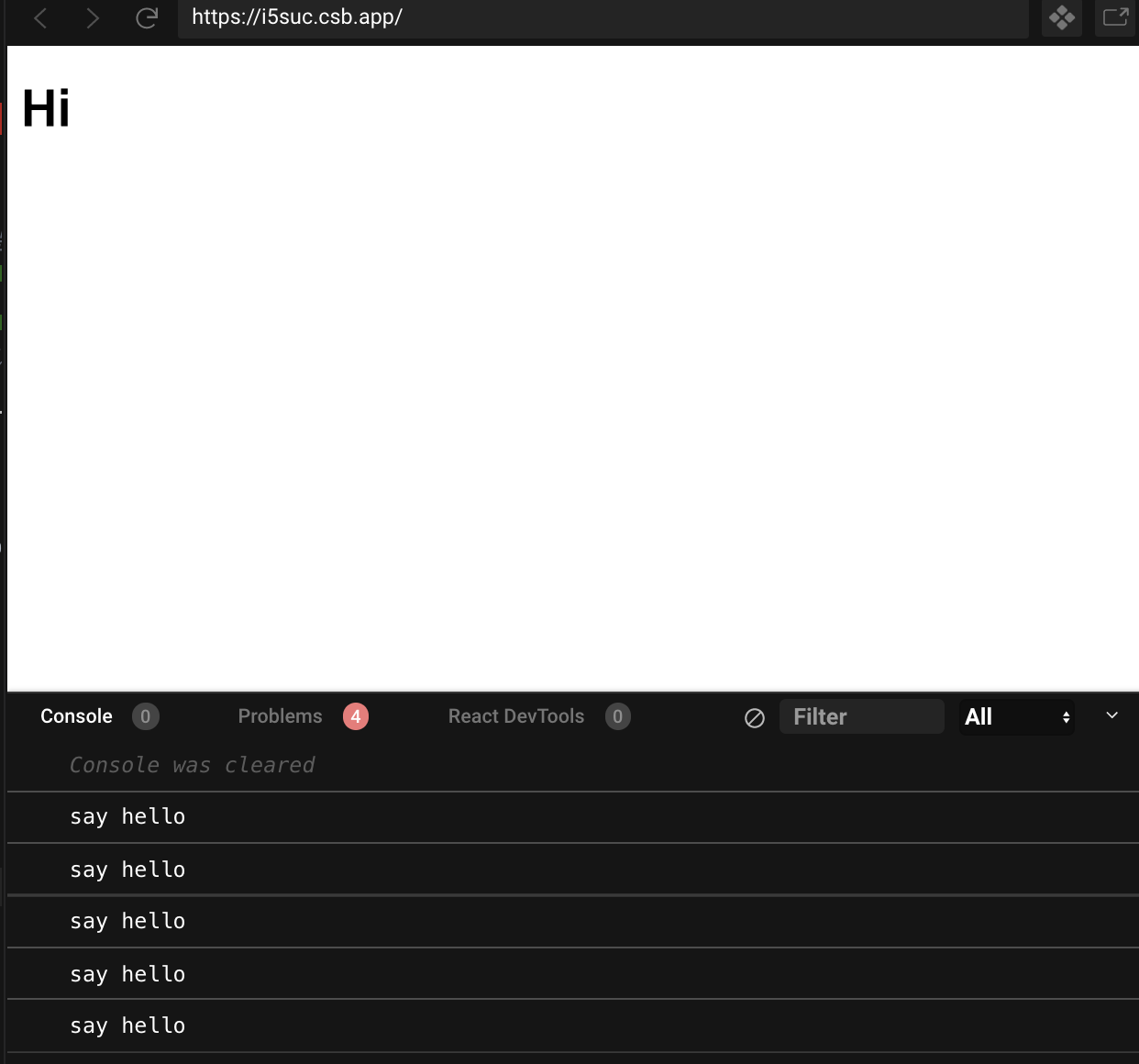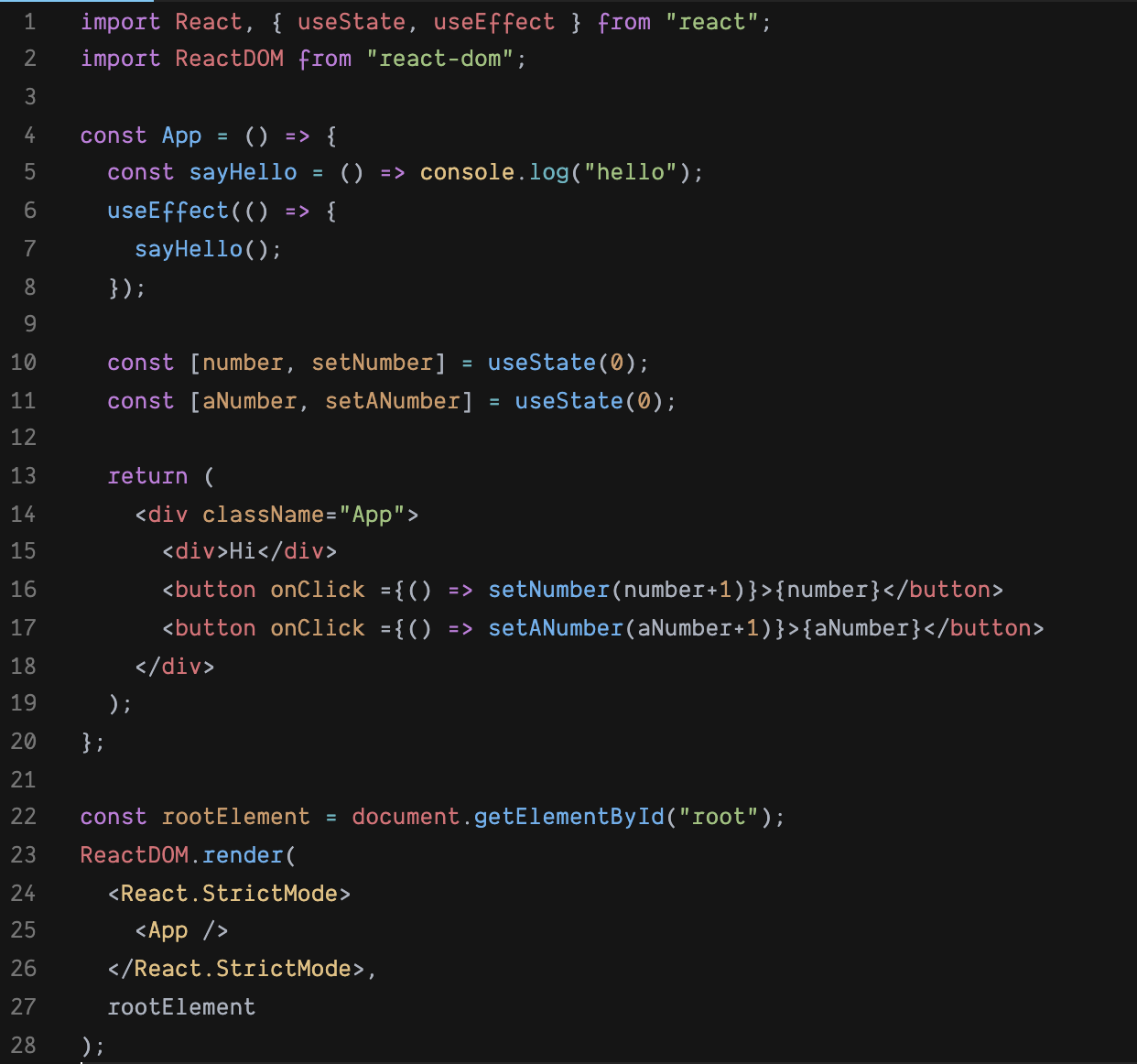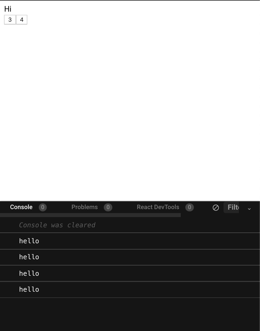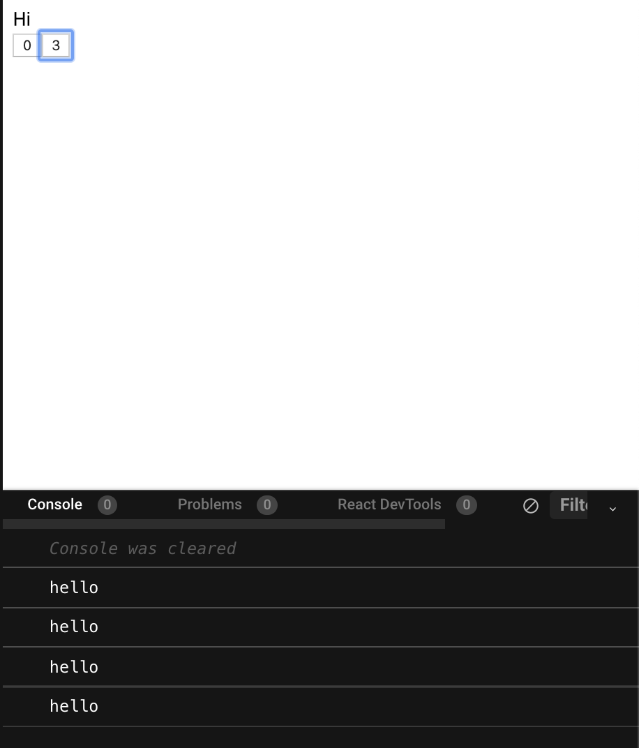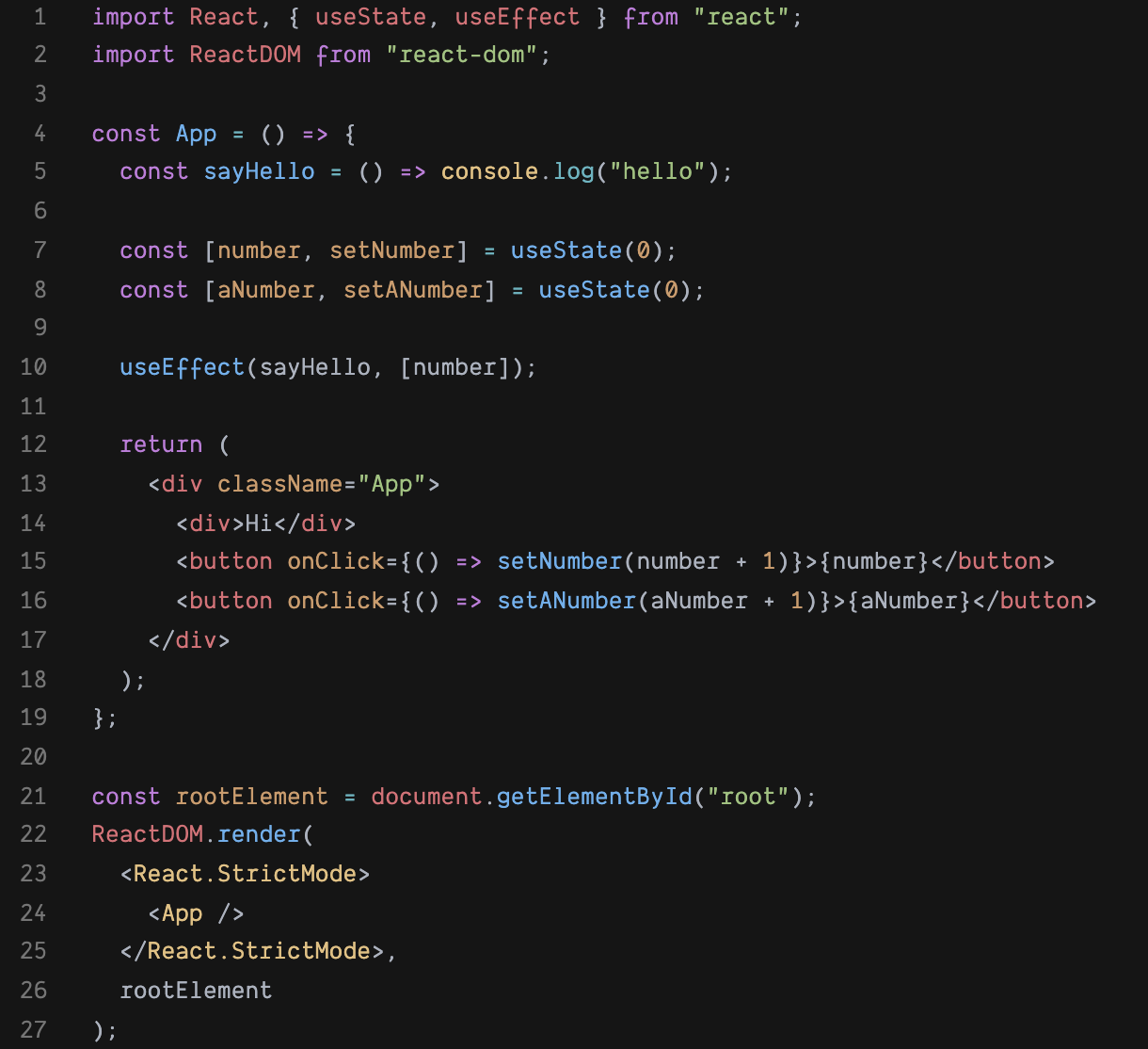 - 여기서 useEffect 두번째 인자 dependency로 [number]를 주었다. 그러면 number를 클릭할때만 콘솔에 hello가 출력되고 aNumber을 클릭했을 때는 출력되지 않는다.