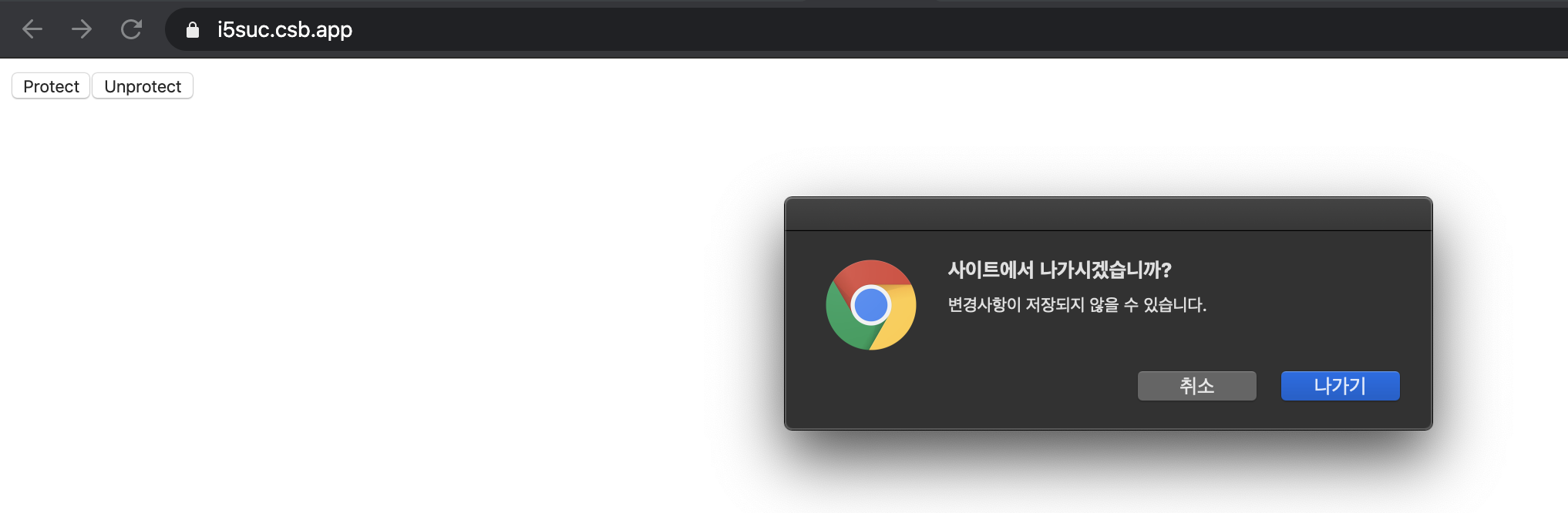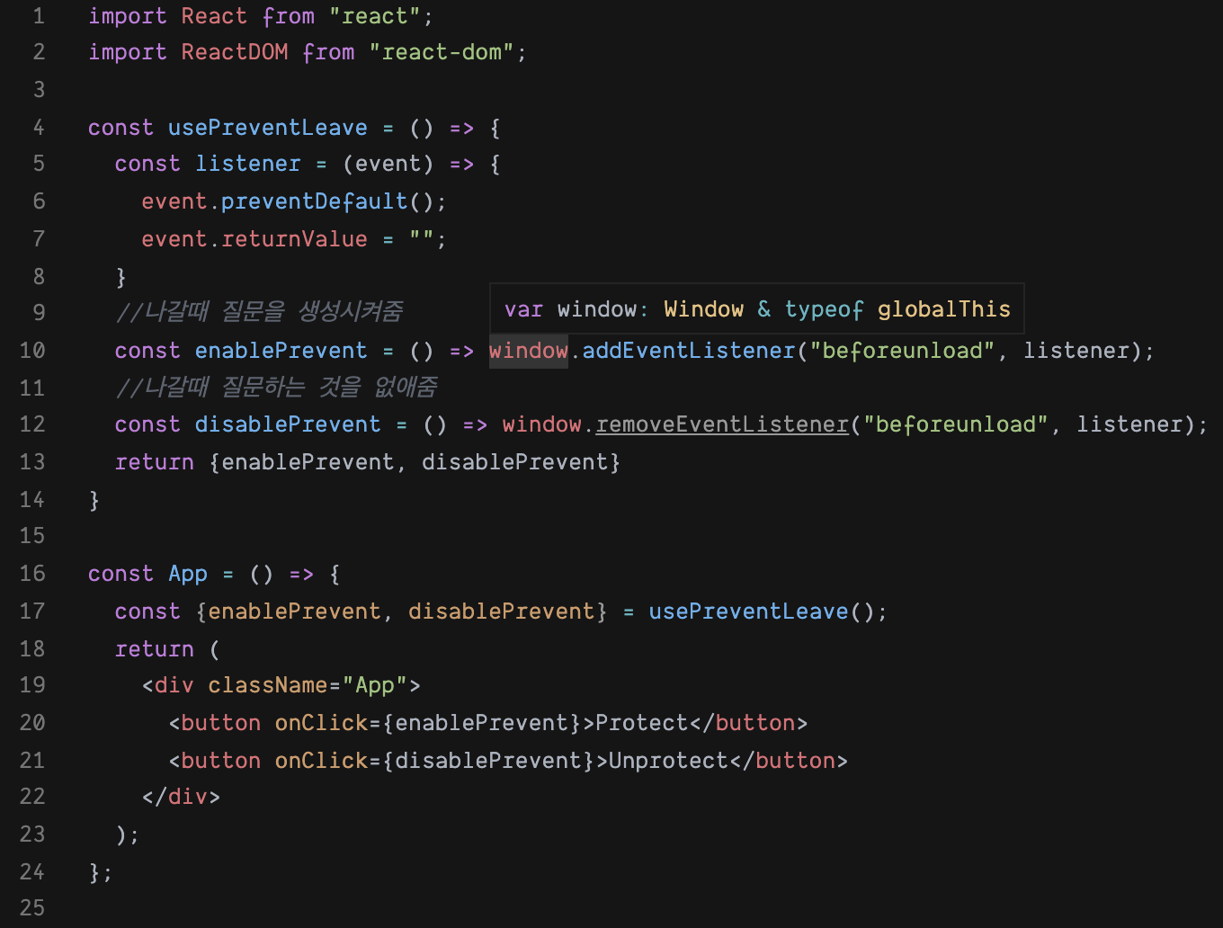 - preventLeave는 보통 웹사이트에서 볼 수 있다. 내가 window창을 닫을 때 정말 나갈 것인지 물어보는 알림창을 띄워준다.
