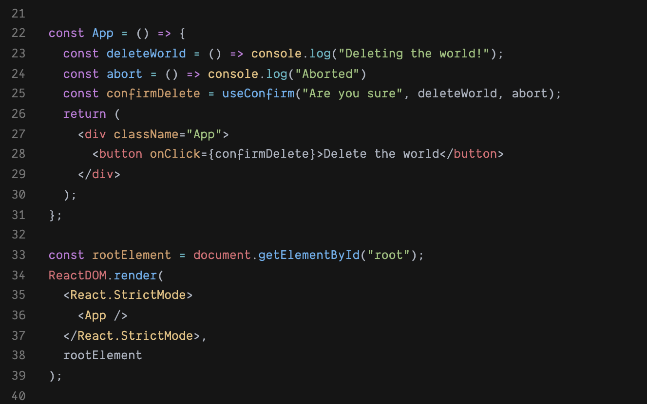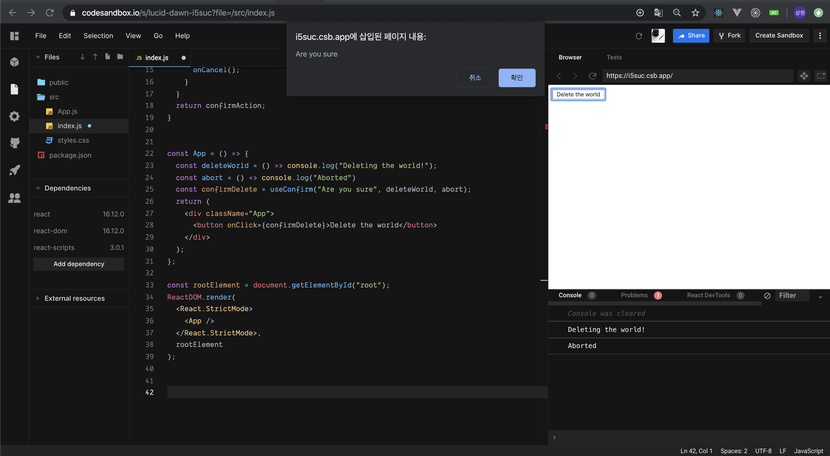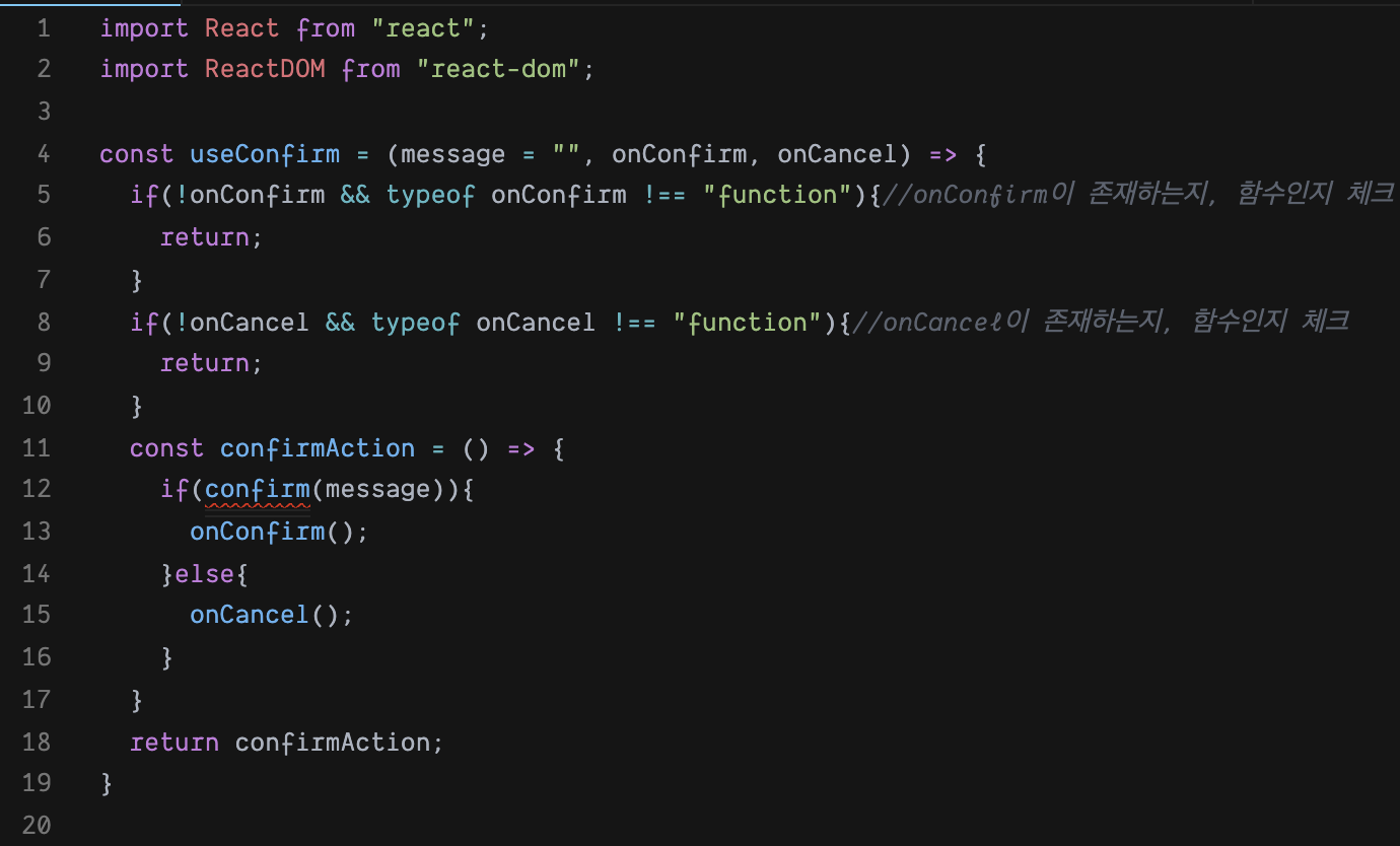 - useConfirm은 사용자가 무언가를 하기전에 (확인)하는 것인데 사용자가 버튼을 클릭하는 작업 을 하면 (이벤트를 실행하기 전에) 메세지를 보여주는 것이다.