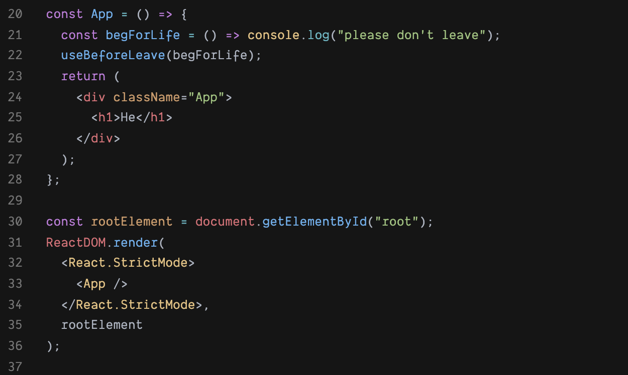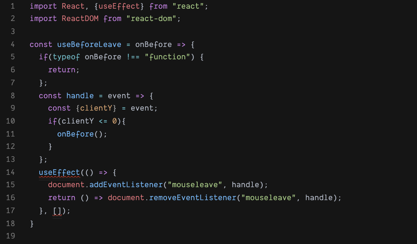 - useBeforeLeave는 마우스가 화면을 벗어날 때 사용자가 정의한 함수를 호출하는 것이다.