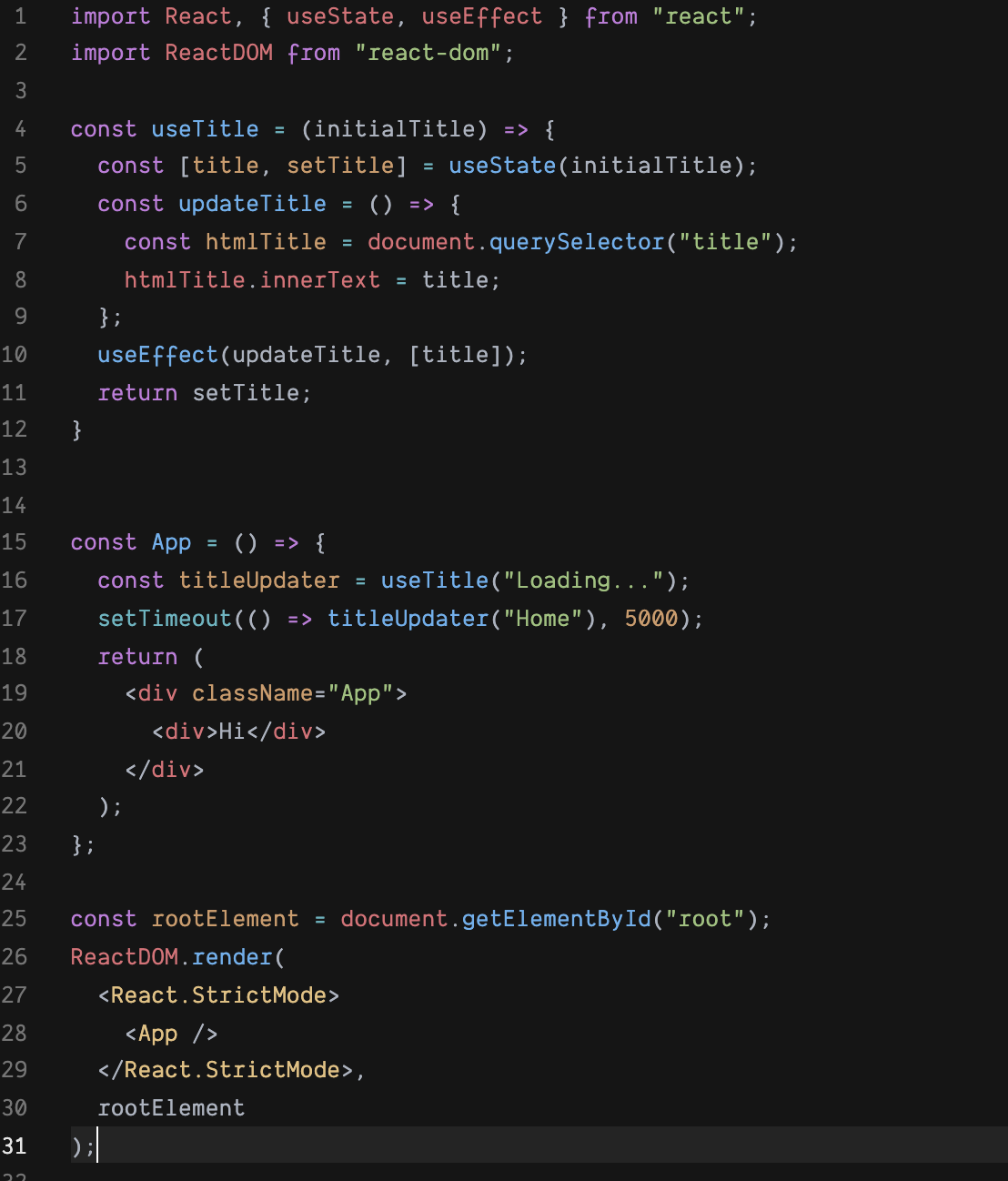 - 이제 useEffect를 사용한 첫번째 hooks인 useTitle에 대하여 알아보겠다.