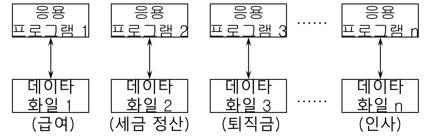 - 문제점 : 주소, 사원번호, 이름과 같은 것이 각 화일에 공통으로 들어가 있을 수 있음. 만약 하나의 프로그램에서 어떤 직원의 주소를 바꾸면 다른 부서에서 봤을 때 바뀐 주소를 볼 수 없음. 따로 관리하기 때문. => 일관성, 정확도가 떨어지고 중복이 되어있음.