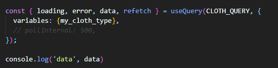 - 쿼리가 일정 주기마다 실행되도록 하여 서버와 실시간에 가까운 동기화를 제공한다. 쿼리에 대한 polling을 활성화하려면 pollInterval 옵션을 설정해준다.