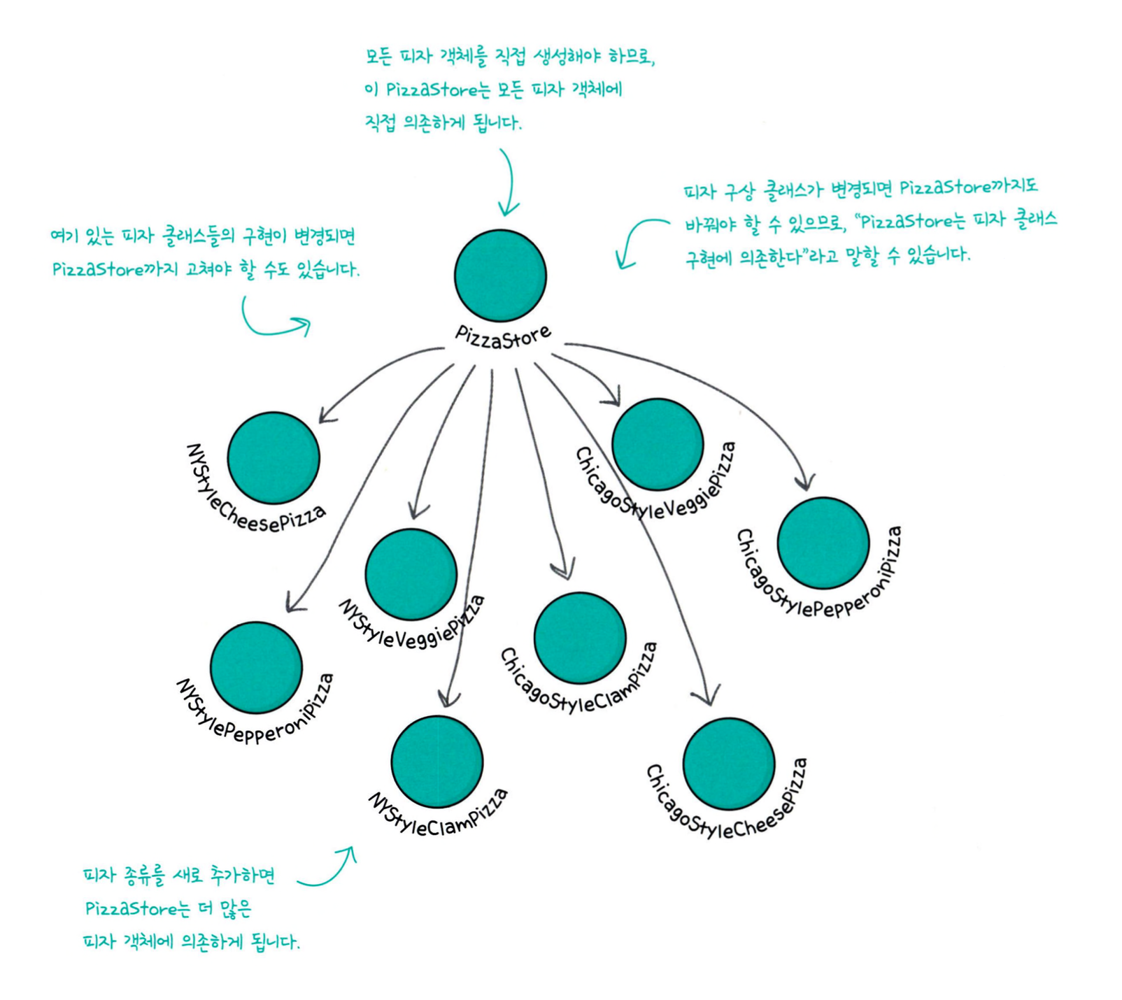 위 코드의 문제점은 인스턴스를 만드는 구상 클래스(new ~~)를 선택하는 부분입니다.
