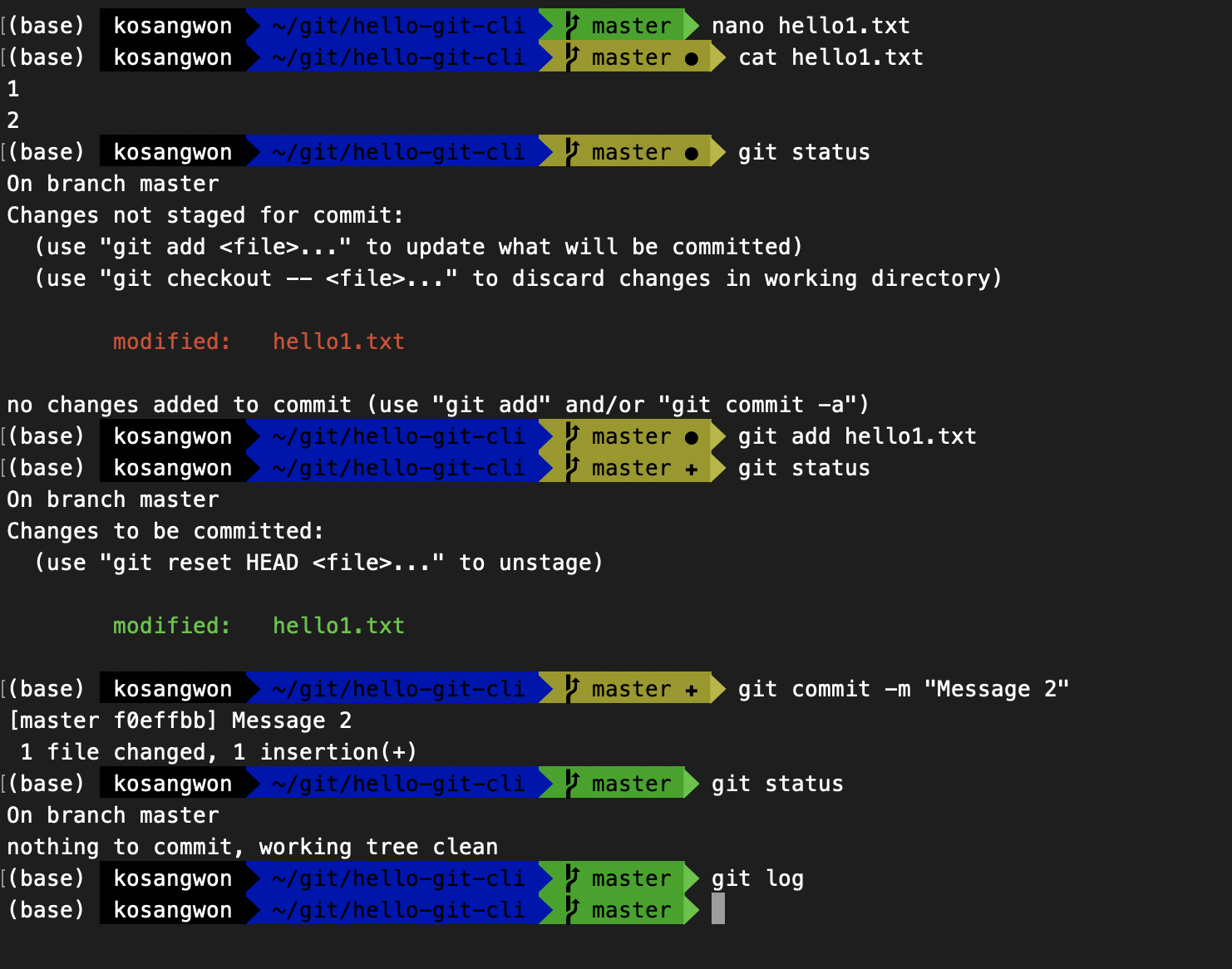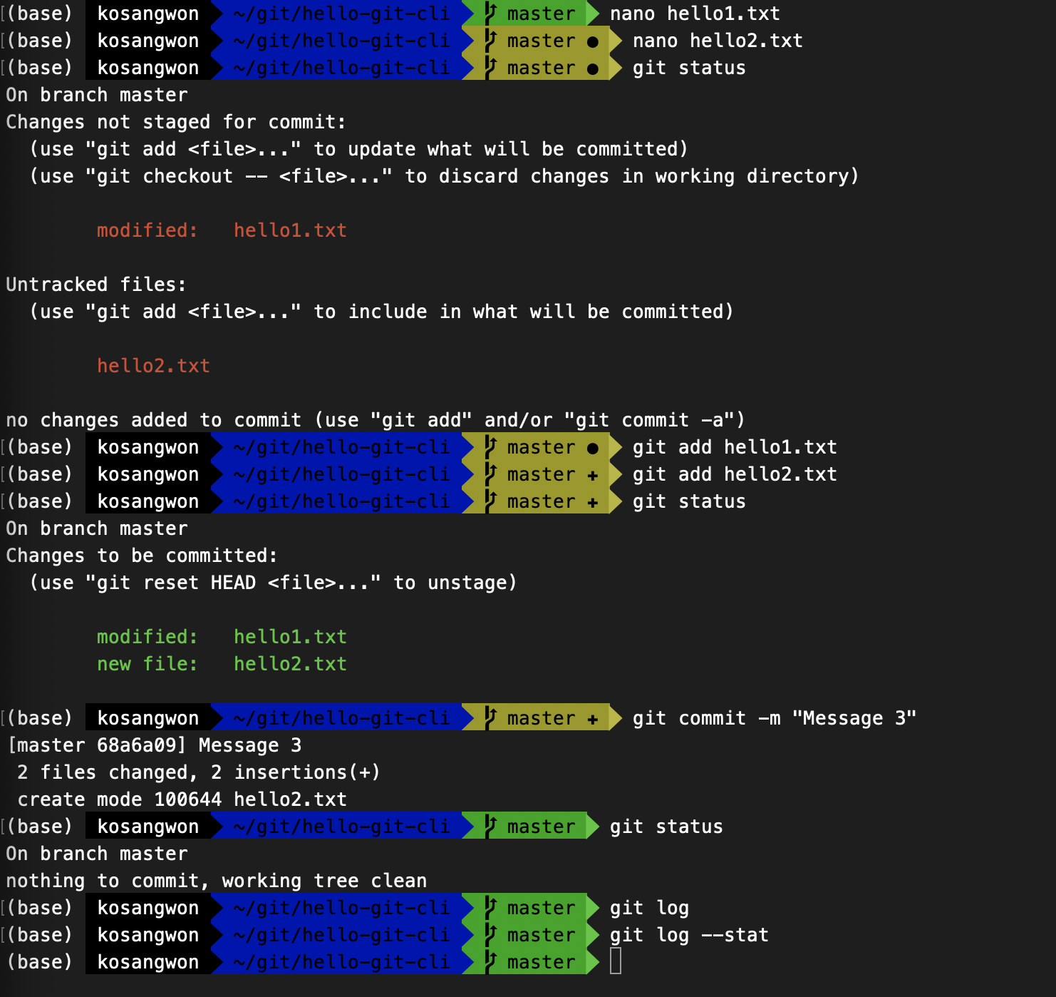 - hello1.txt 파일을 수정하고 hello2.txt 파일을 하나 더 만들었다.
