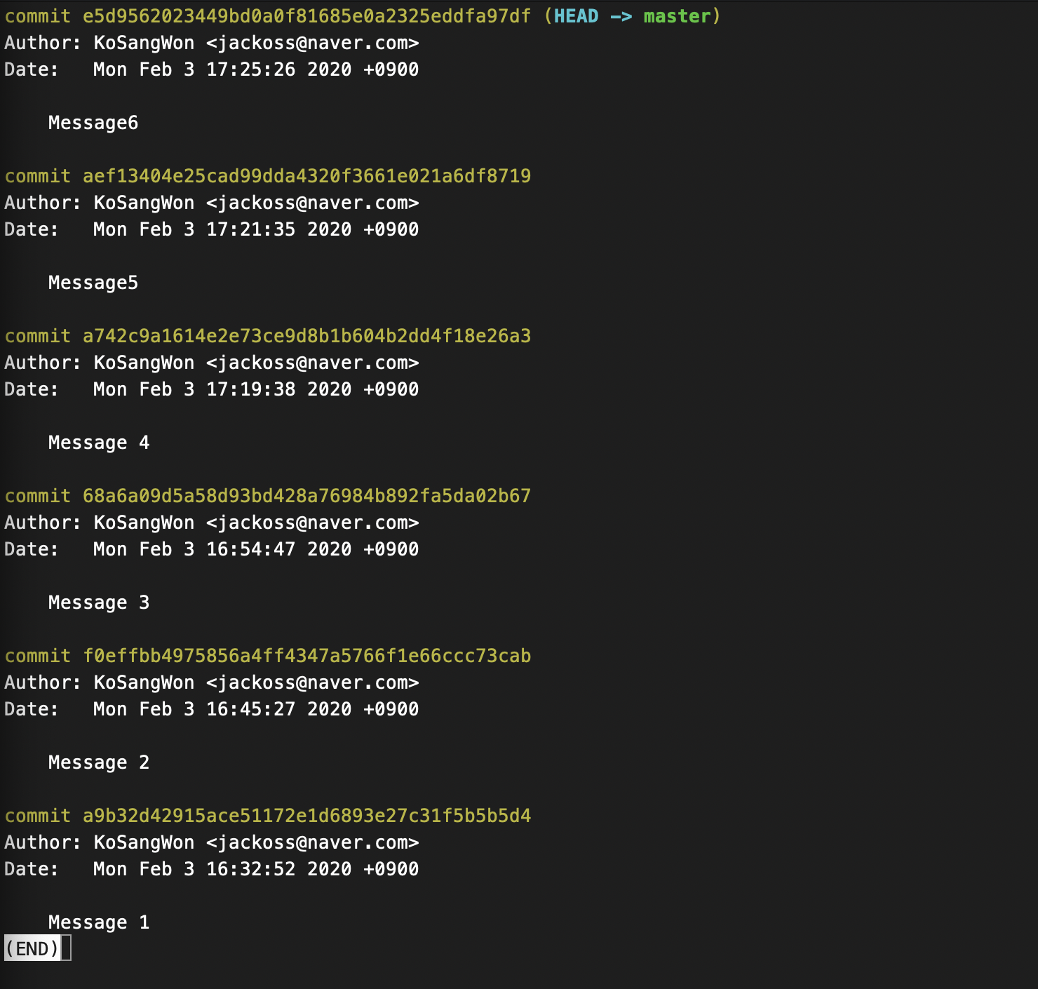 - git log 를 실행하면 다음과 같은 화면이 뜬다.