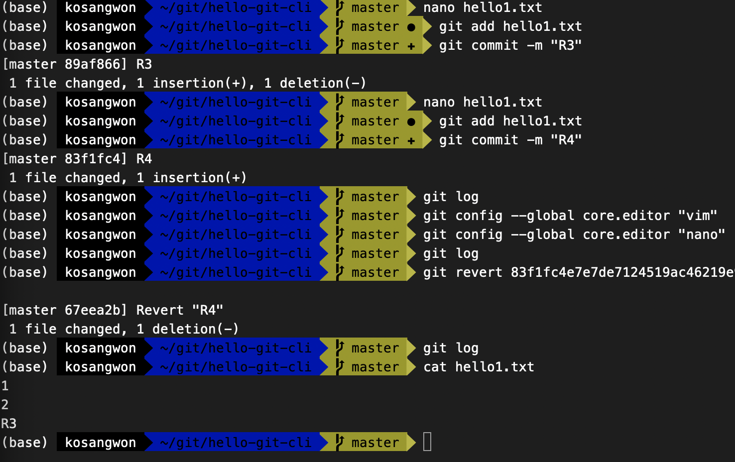 - hello1.txt에 R3을 추가 하고 commit 후 R4 추가 하고 commit 한후 작업해보겠다.