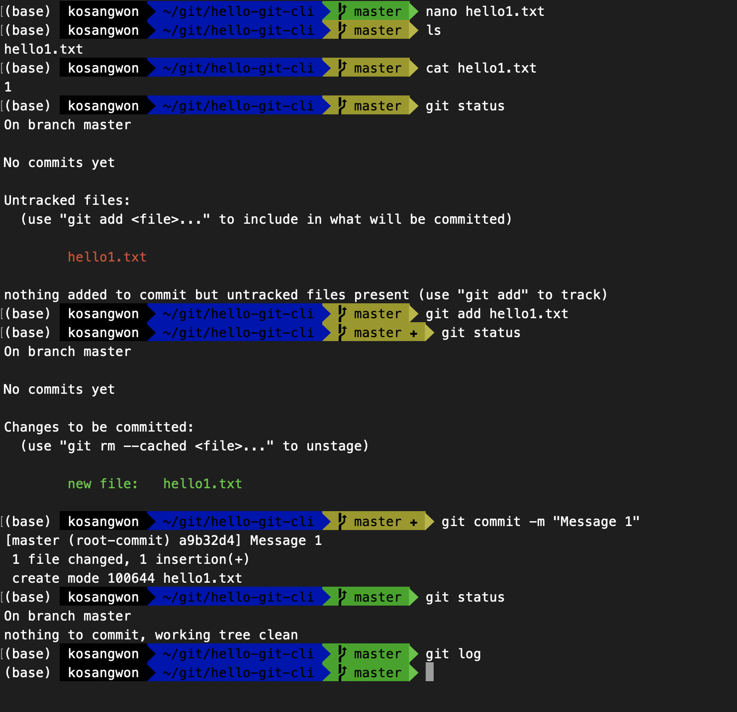 - git add hello1.txt : hello1.txt 를 Staging Area에 추가함