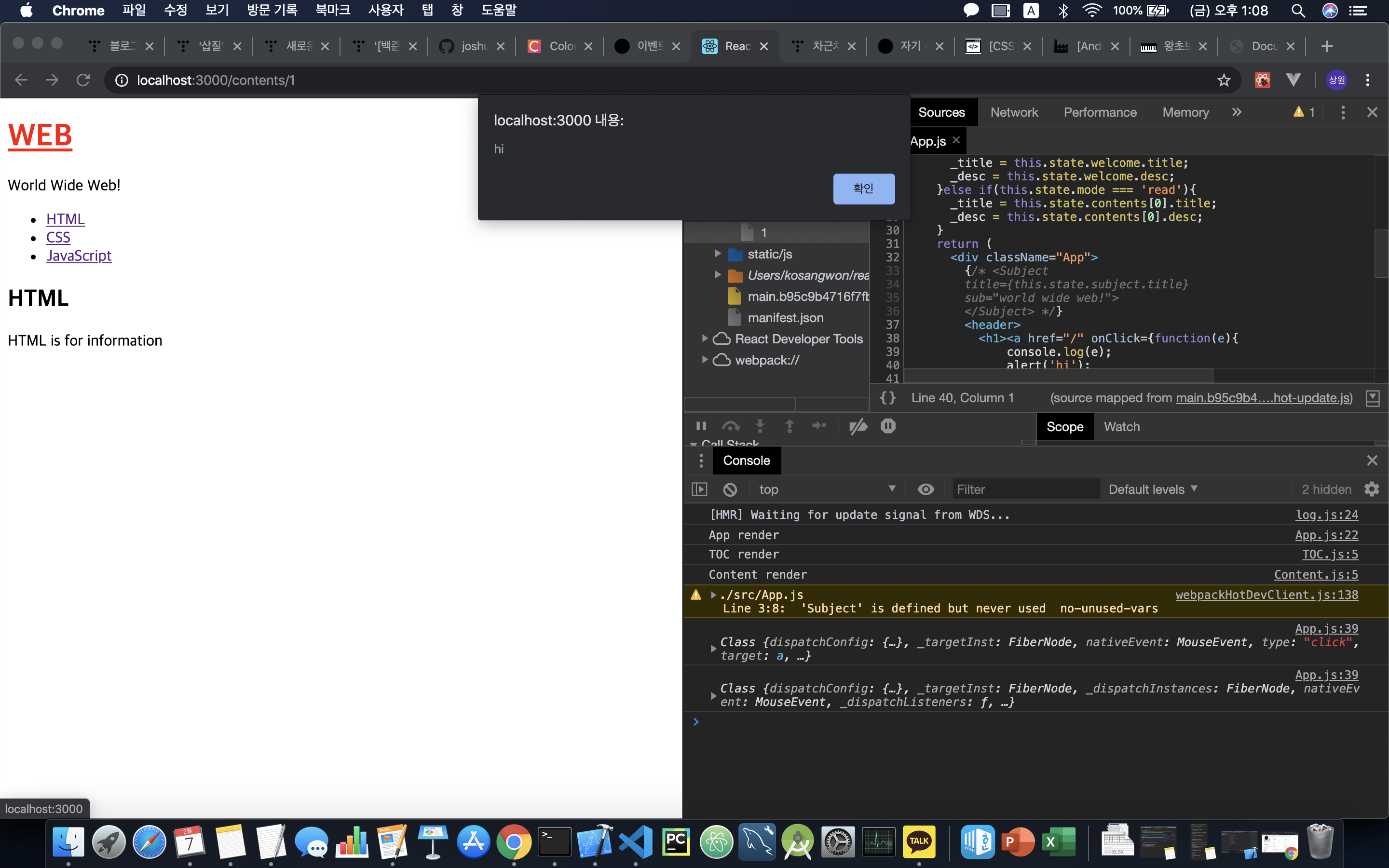 - alert('hi') 라는 코드는 'hi'라는 경고창을 띄워주는데 문제는 경고창 뜬 후 '확인' 버튼을 누르면 화면이 Reload된다. 그것은 React에서 지양하는 것이다.