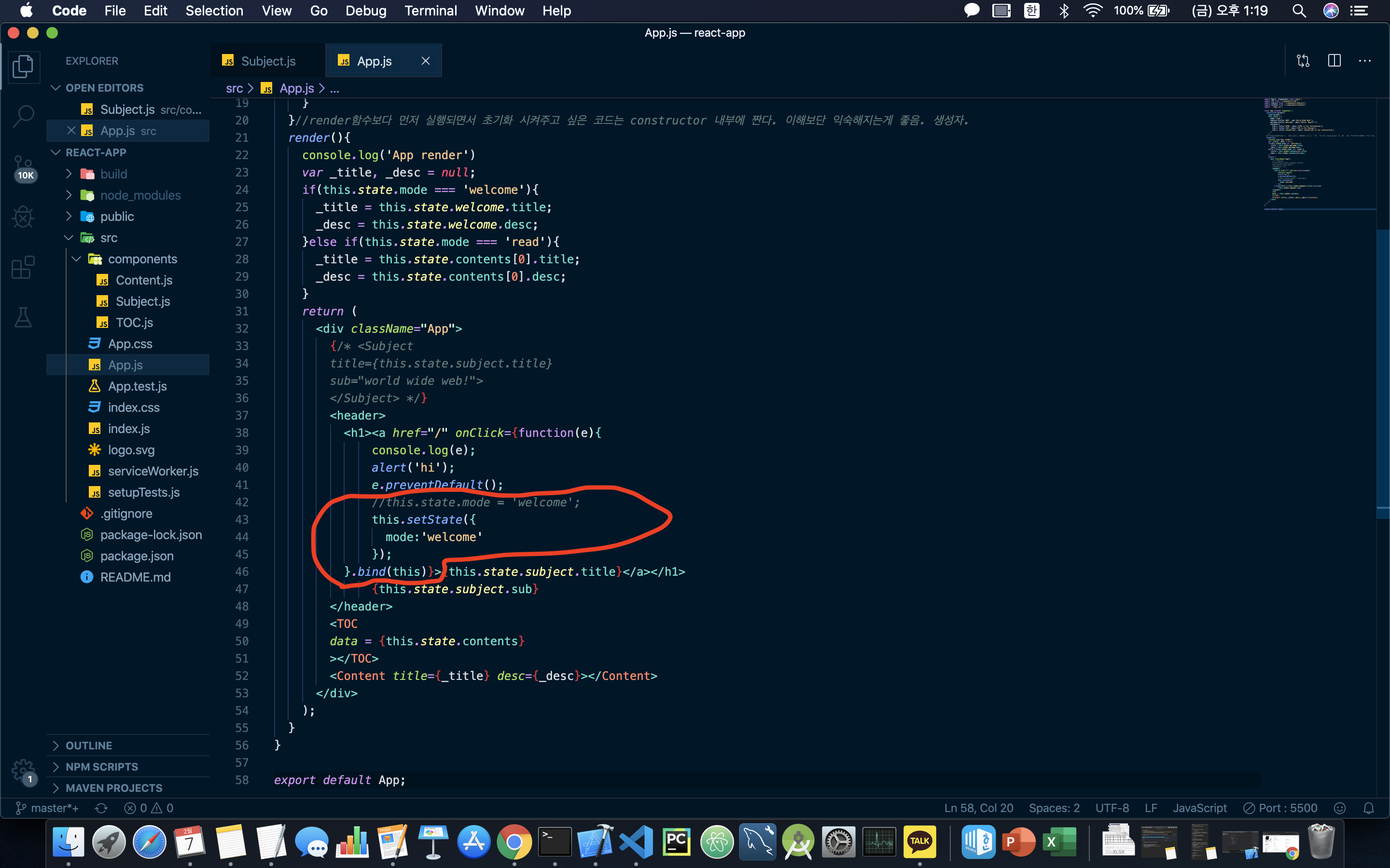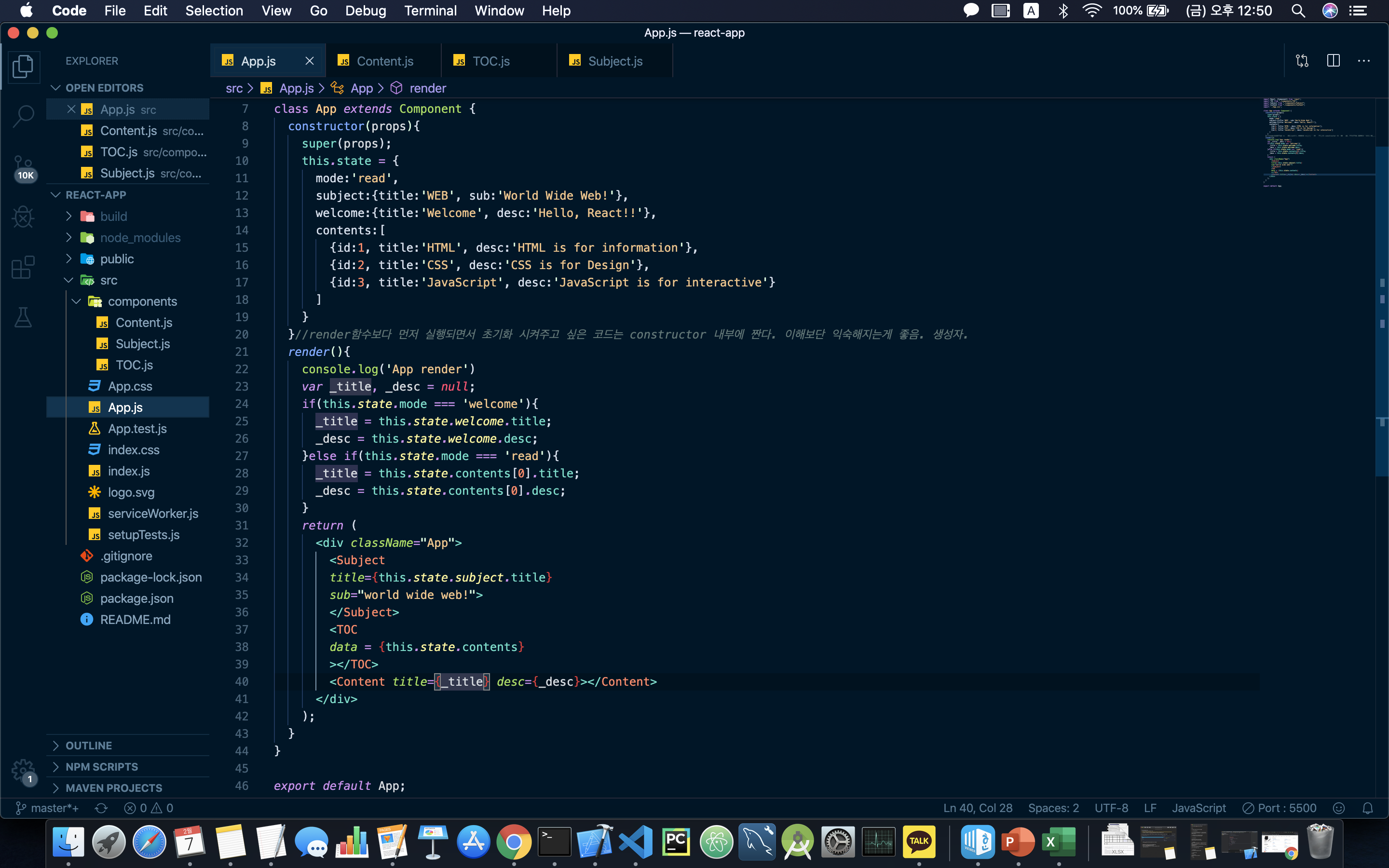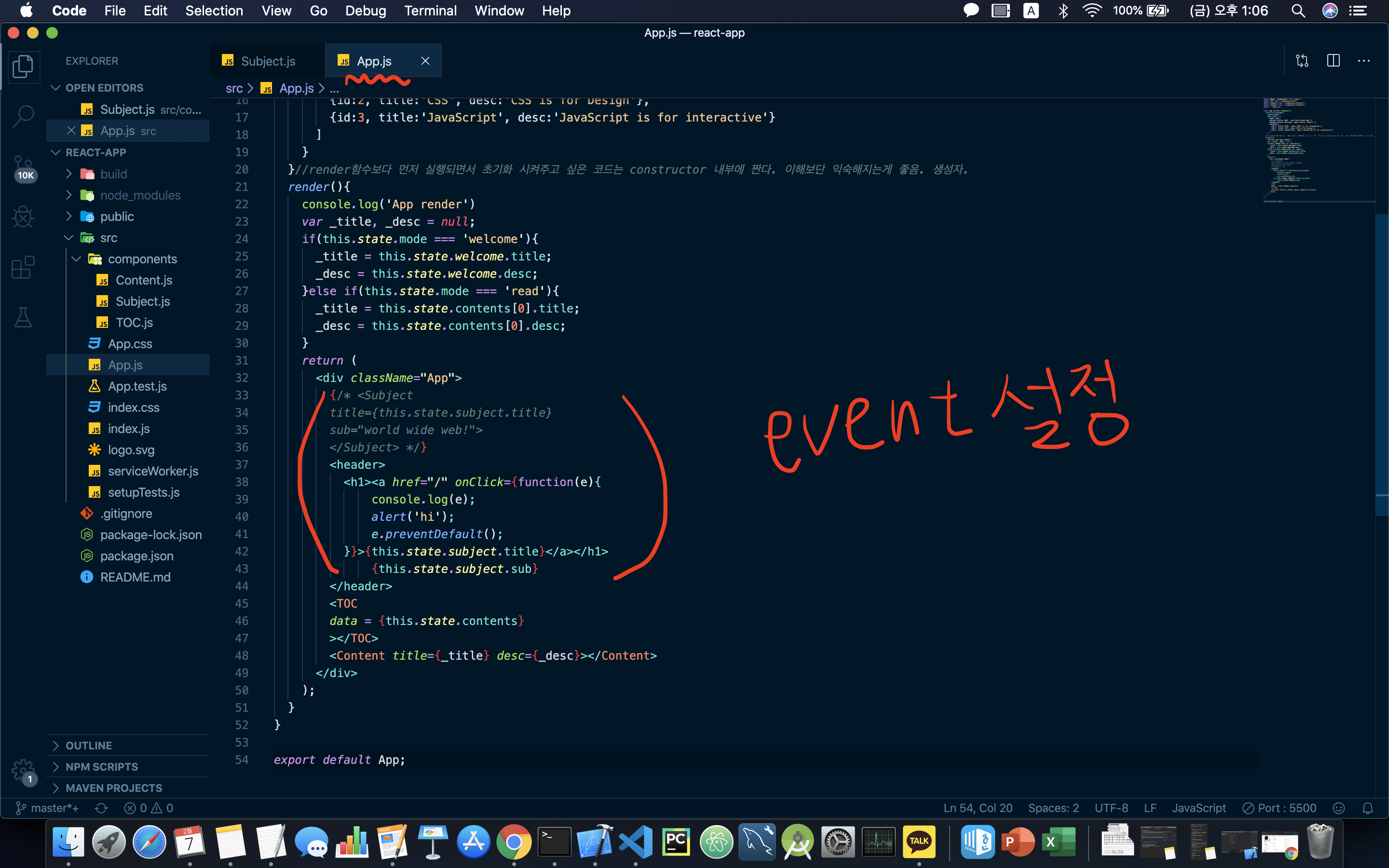 - Subject.js에서 하는 것은 복잡하기 때문에 App.js로 코드를 직접 써준다음 설치해보겠다.