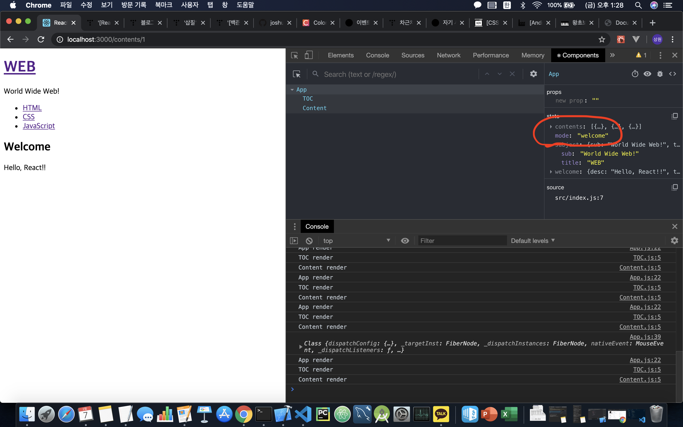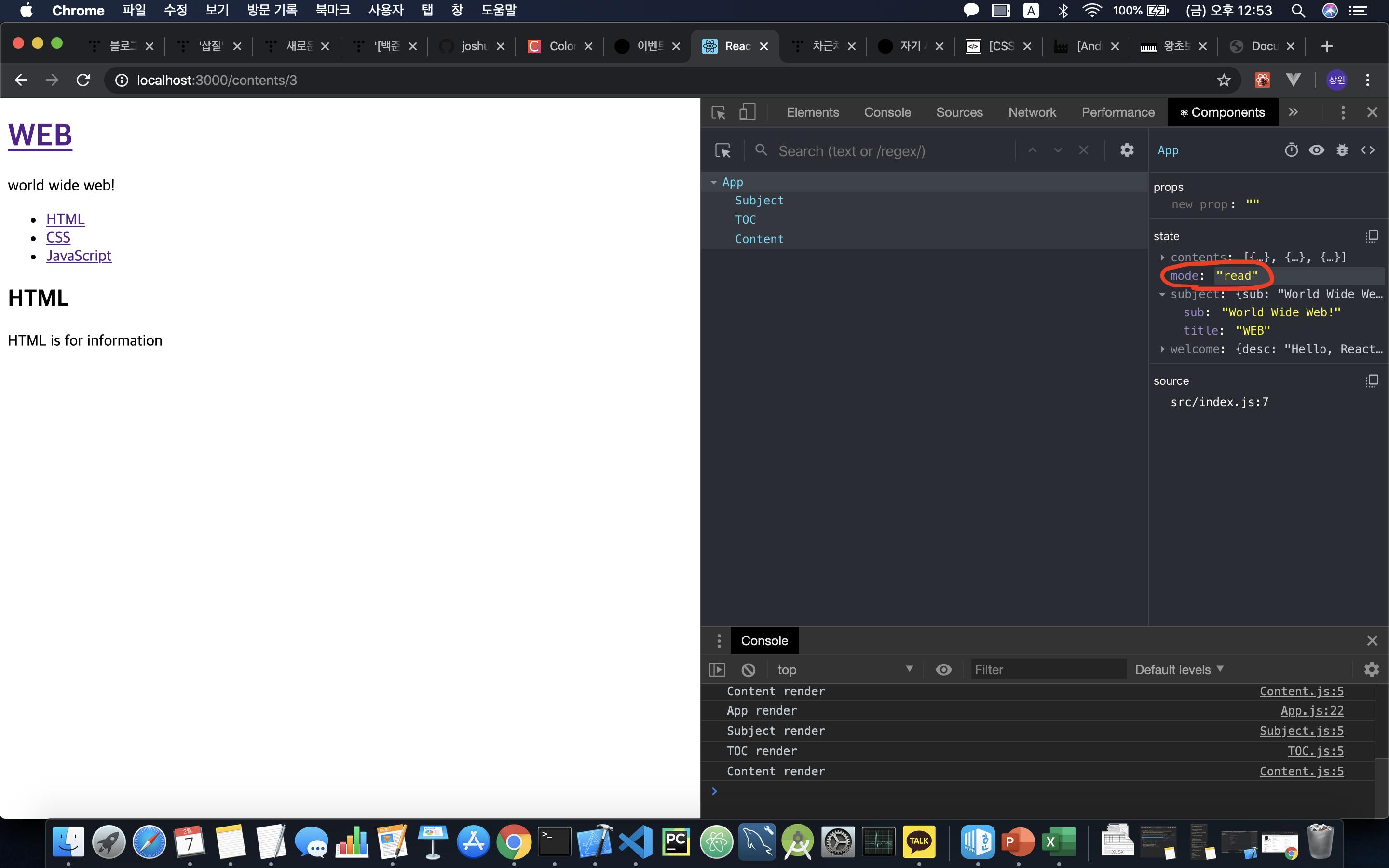 - 아래는 mode가 read일 때 웹페이지 화면이다. 여기서 React 개발자 도구에 들어간 후 직접 값을 변경할 수 있다.