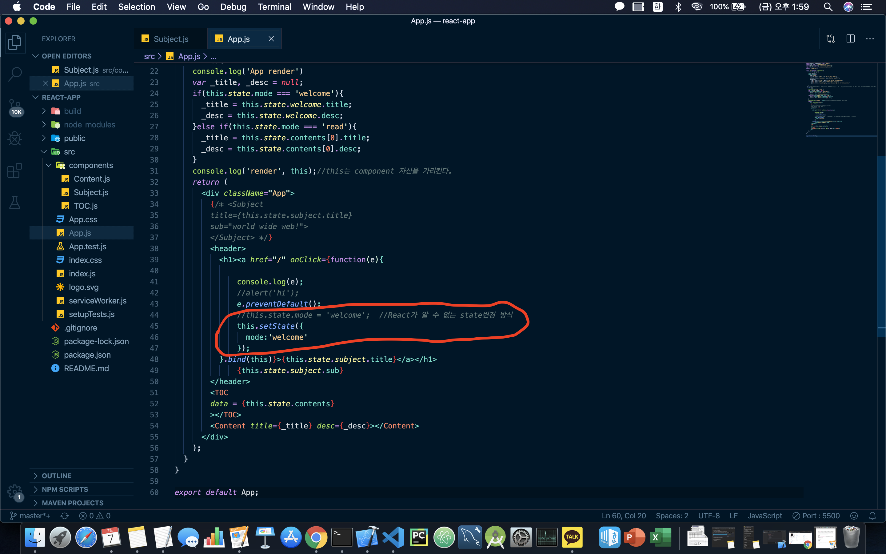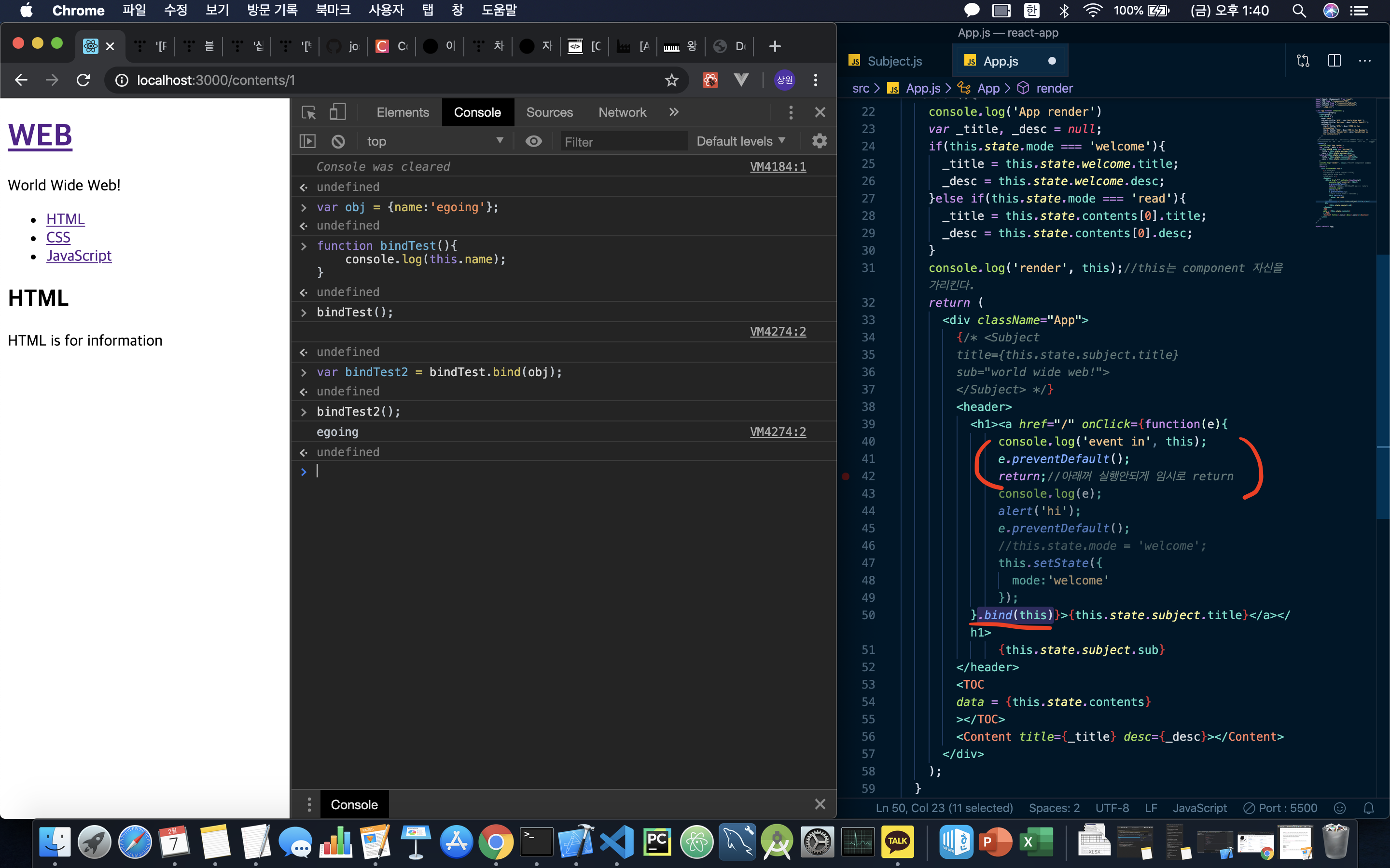 - render함수안에서 this는 render함수가 속해있는 컴포넌트 자체를 가리키는데 이벤트에 속해있는 함수는 이상하게도 this가 아무값도 없다.(원리는 잘 모르겠음. 그래도 강제로 this를 주입하는 방법을 사용해서 해결 가능)