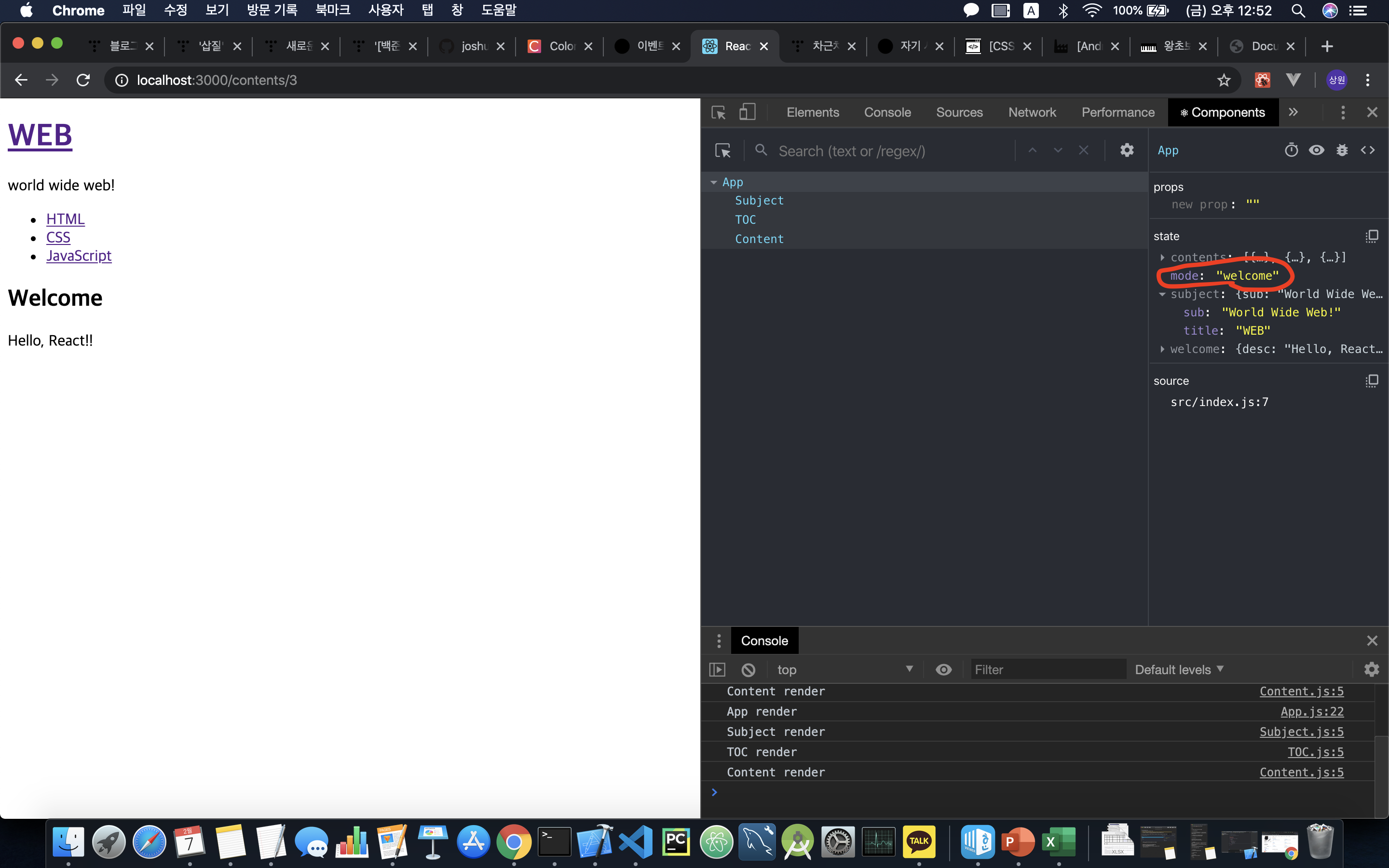 - 이벤트에서 state를 변경하기 위해 this.state.mode='welcome'이라는 코드를 작성하였다. 그러나 Error 발생.