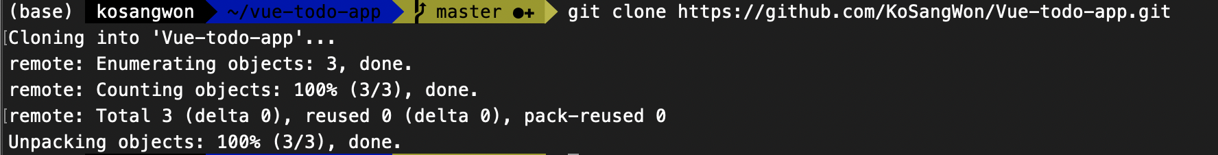 - 그 후 로컬에 vue-todo-app이라는 폴더를 하나 만들고 git clone [github repository address] 을 실행시켜주었다.