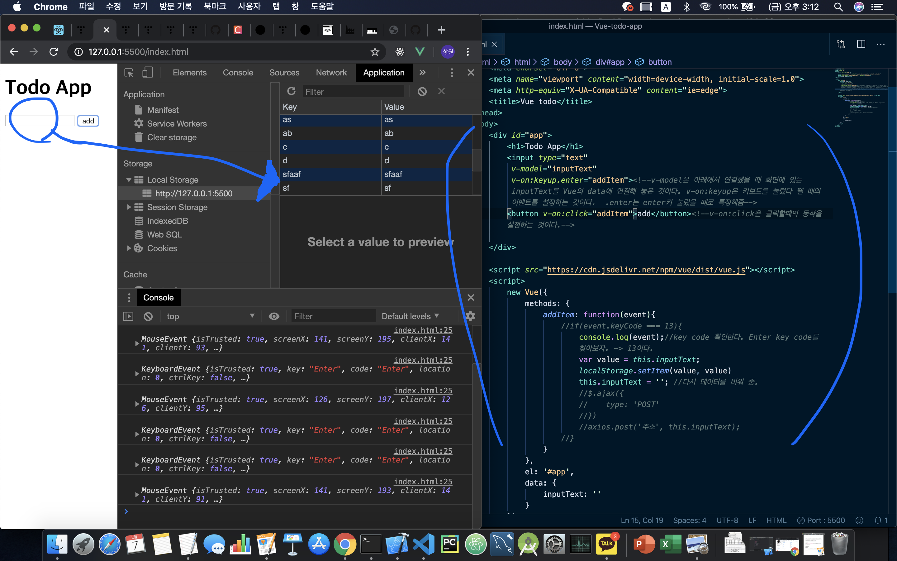 - v-on:keyup="addItem" => 키보드를 눌렀다가 뗄 때 addItem을 실행한다.