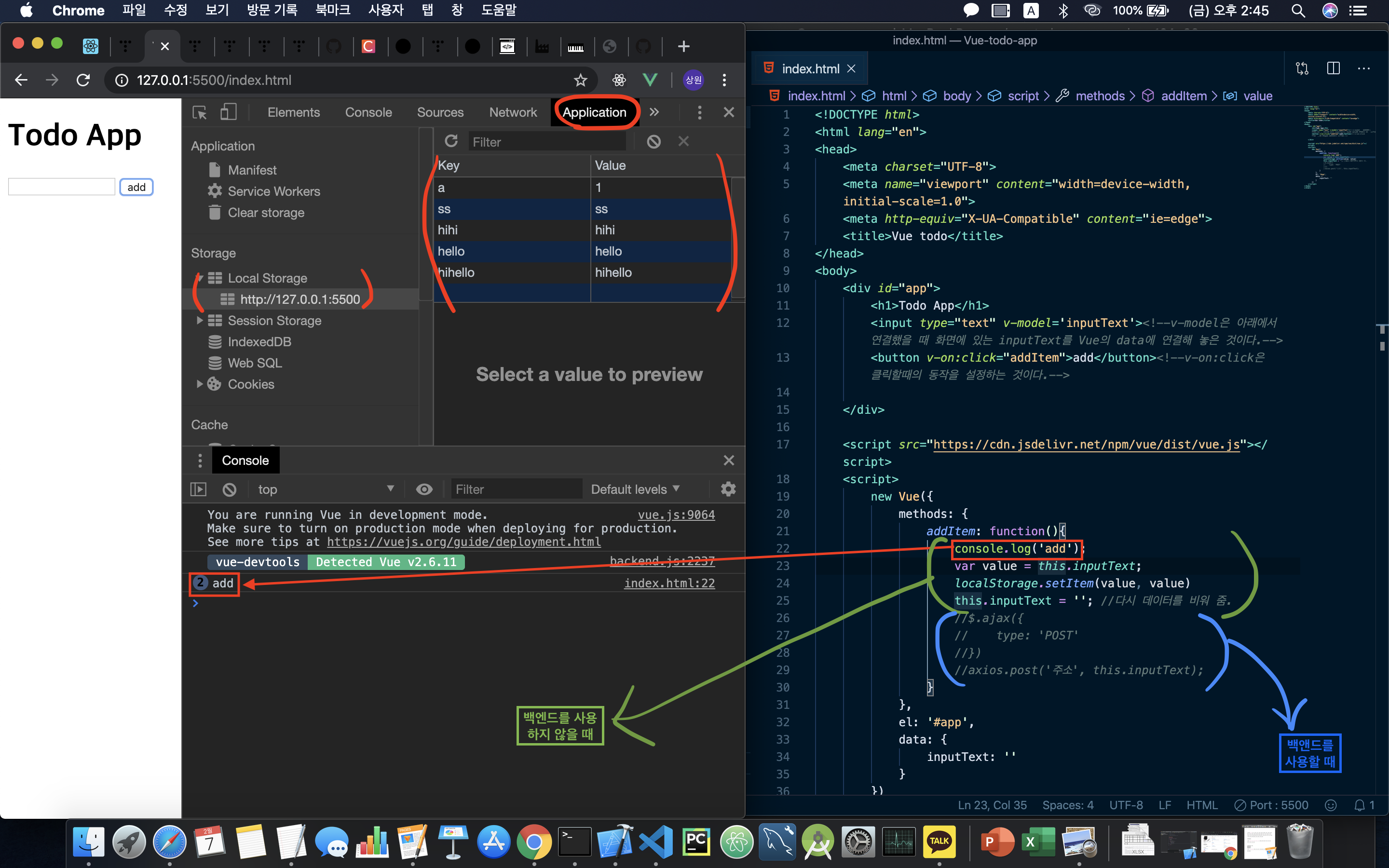 - 백엔드를 구성하지 않는다는 가정하에 데이터를 저장하고 싶다면 개발자도구의 Application 탭에서 할 수 있다.