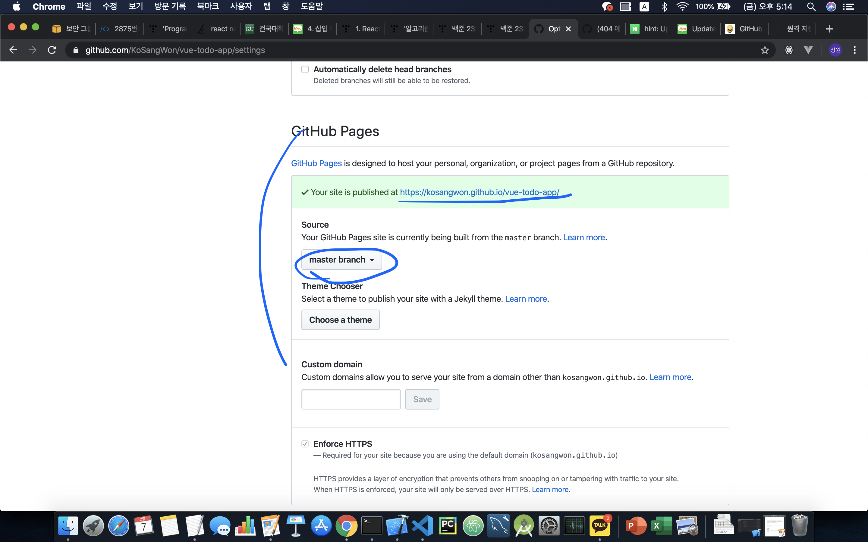- Settings -> Github Pages 에서 Source 를 master branch로 바꿔주면 배포가 완료된다.
