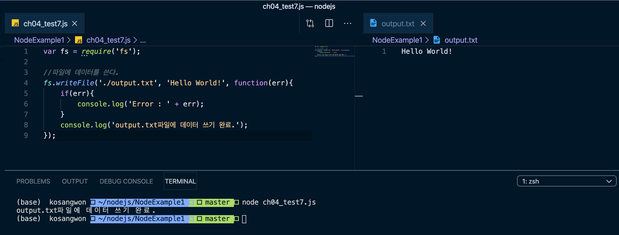 - writeFile() 메소드는 첫번째 파라미터로서 파일 이름을 전달받고 두 번째 파라미터는 파일에 쓸 내용이고 세 번째는 작업이 끝나면 호출될 콜백 함수이다.
